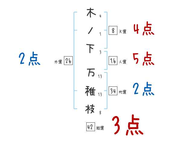 天運![]() | 木ノ下万稚枝さんの天運は8画の4つ星!勤勉家。根気強く努力し成功する。忍耐力がある。 家系が持つ宿命的な運勢を表します。祖先から受け継いだ苗字ですので自分の力が及びません。家柄を象徴します。 |