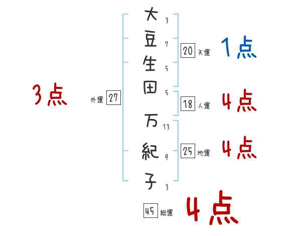 総運![]() | 大豆生田万紀子さんの総運は45画の4つ星!もくもくと物事を進め達成する。地味な努力家。 あなたの人生を表す1番重要な運勢です。生涯を通じて影響する総合運となり、主に50歳以降の晩年期に影響を及ぼします。 |