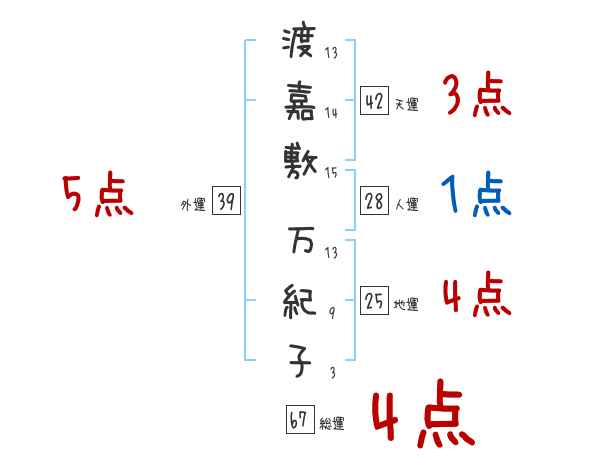 外運![]() | 渡嘉敷万紀子さんの外運は39画の5つ星!社交性に優れ人望が厚い。人の上に立ち成功する。 生活面を象徴する運勢です。外部から受ける影響力を表し、結婚運、家庭運や職場、環境への順応性を表します。 |