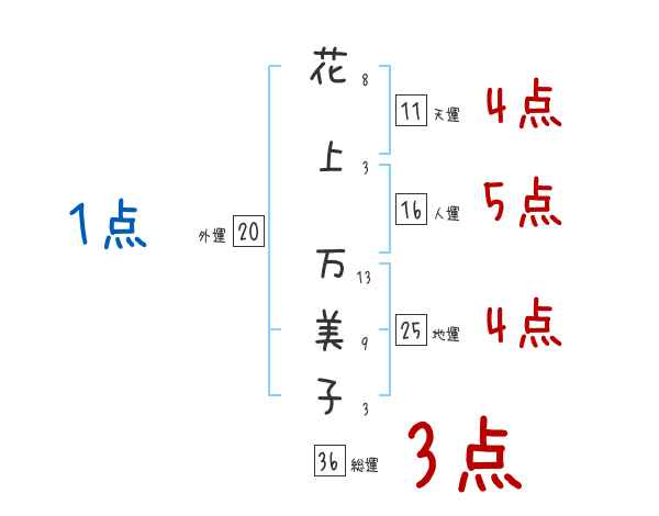 天運![]() | 花上万美子さんの天運は11画の4つ星!着実に富や地位を得る幸運な人生。 家系が持つ宿命的な運勢を表します。祖先から受け継いだ苗字ですので自分の力が及びません。家柄を象徴します。 |