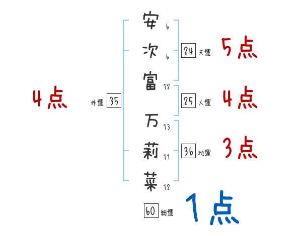天運![]() | 安次富万莉菜さんの天運は24画の5つ星!家庭運が良く順調な人生。金運にも恵まれる。 家系が持つ宿命的な運勢を表します。祖先から受け継いだ苗字ですので自分の力が及びません。家柄を象徴します。 |