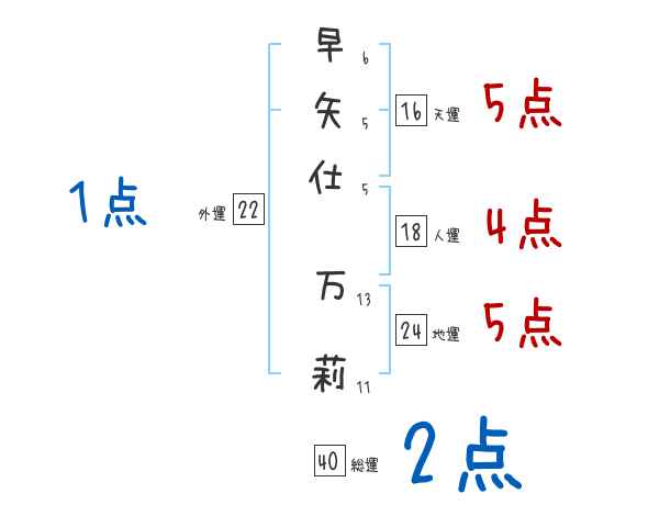 天運![]() | 早矢仕万莉さんの天運は16画の5つ星!人望が厚く大きく発展する。逆転成功が見える。 家系が持つ宿命的な運勢を表します。祖先から受け継いだ苗字ですので自分の力が及びません。家柄を象徴します。 |