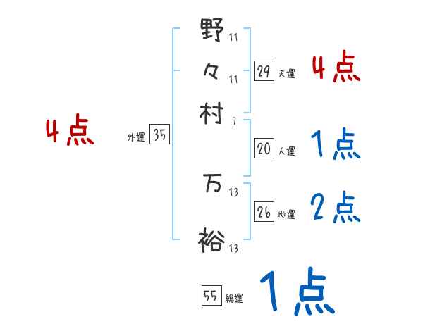 天運![]() | 野々村万裕さんの天運は29画の4つ星!完全主義で才能がある。厳格な心の持ち主。 家系が持つ宿命的な運勢を表します。祖先から受け継いだ苗字ですので自分の力が及びません。家柄を象徴します。 |