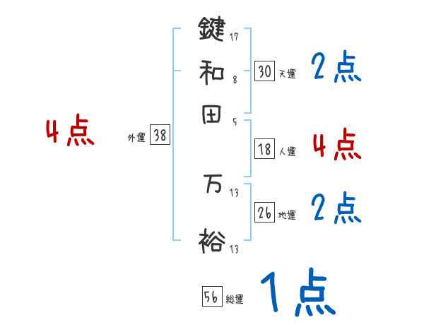 天運![]() | 鍵和田万裕さんの天運は30画の2つ星!浮き沈みの激しさに注意しましょう。 家系が持つ宿命的な運勢を表します。祖先から受け継いだ苗字ですので自分の力が及びません。家柄を象徴します。 |