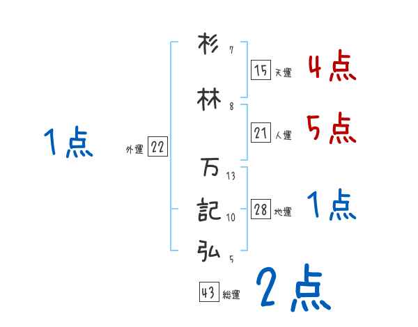 外運![]() | 杉林万記弘さんの外運は22画の1つ星!努力することが苦手ないっぽう手先が器用。芸術性にも優れる。 生活面を象徴する運勢です。外部から受ける影響力を表し、結婚運、家庭運や職場、環境への順応性を表します。 |