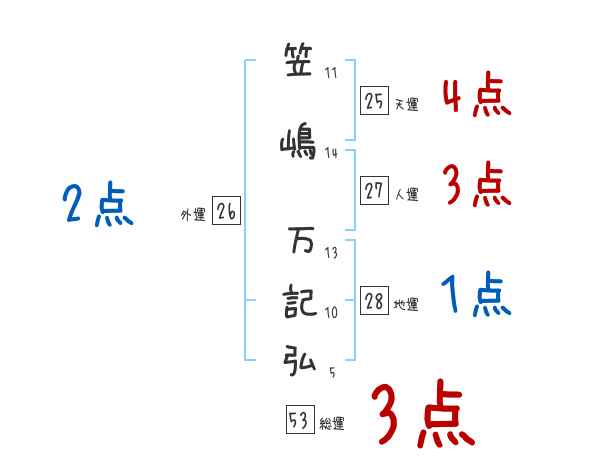 外運![]() | 笠嶋万記弘さんの外運は26画の2つ星!波瀾万丈かも。信頼できる人を大事にしましょう。 生活面を象徴する運勢です。外部から受ける影響力を表し、結婚運、家庭運や職場、環境への順応性を表します。 |