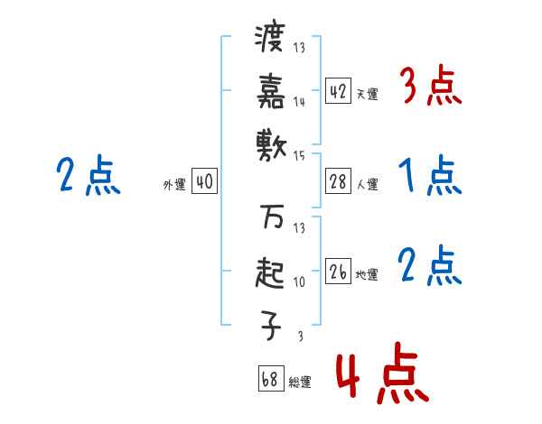 総運![]() | 渡嘉敷万起子さんの総運は68画の4つ星!潜在能力が高く集中力が高い。勤勉に励み発展する。 あなたの人生を表す1番重要な運勢です。生涯を通じて影響する総合運となり、主に50歳以降の晩年期に影響を及ぼします。 |