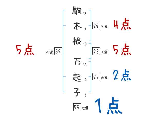 外運![]() | 駒木根万起子さんの外運は32画の5つ星!柔軟性があり成功する。チャンスが多く金運が良い。 生活面を象徴する運勢です。外部から受ける影響力を表し、結婚運、家庭運や職場、環境への順応性を表します。 |