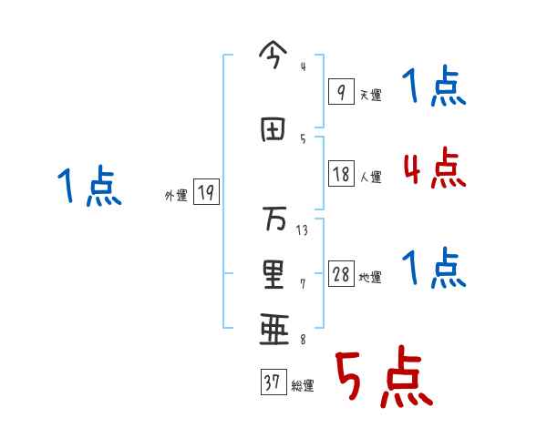総運![]() | 今田万里亜さんの総運は37画の5つ星!努力家で順応性に優れる。現実的な考え方ができ忠実に物事をこなす。 あなたの人生を表す1番重要な運勢です。生涯を通じて影響する総合運となり、主に50歳以降の晩年期に影響を及ぼします。 |