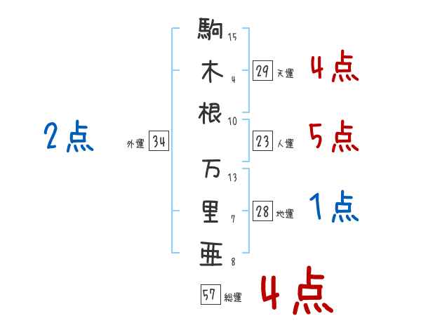 総運![]() | 駒木根万里亜さんの総運は57画の4つ星!向上心があり人望がある。地位を得る。 あなたの人生を表す1番重要な運勢です。生涯を通じて影響する総合運となり、主に50歳以降の晩年期に影響を及ぼします。 |
