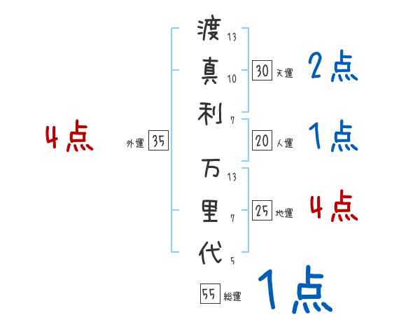 天運![]() | 渡真利万里代さんの天運は30画の2つ星!浮き沈みの激しさに注意しましょう。 家系が持つ宿命的な運勢を表します。祖先から受け継いだ苗字ですので自分の力が及びません。家柄を象徴します。 |