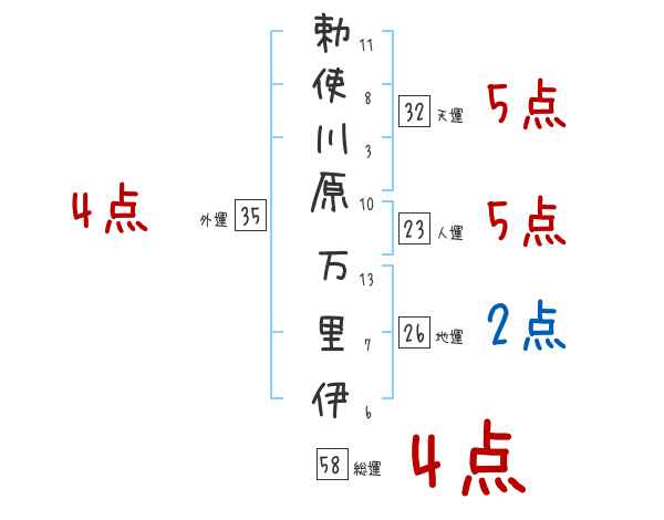 外運![]() | 勅使川原万里伊さんの外運は35画の4つ星!温厚な性格で感受性が高い。穏和な性格で人望が厚い。 生活面を象徴する運勢です。外部から受ける影響力を表し、結婚運、家庭運や職場、環境への順応性を表します。 |