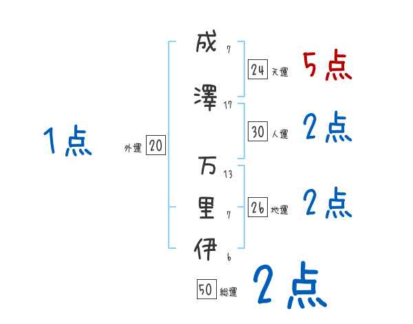 天運![]() | 成澤万里伊さんの天運は24画の5つ星!家庭運が良く順調な人生。金運にも恵まれる。 家系が持つ宿命的な運勢を表します。祖先から受け継いだ苗字ですので自分の力が及びません。家柄を象徴します。 |