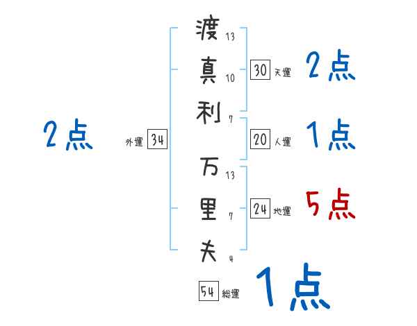総運![]() | 渡真利万里夫さんの総運は54画の1つ星!トラブルが多いかも。周りをよく見て協調して過ごしましょう。 あなたの人生を表す1番重要な運勢です。生涯を通じて影響する総合運となり、主に50歳以降の晩年期に影響を及ぼします。 |