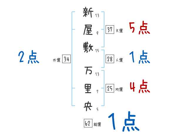 人運![]() | 新屋敷万里央さんの人運は28画の1つ星!家庭環境に注意。スポーツで活躍できる能力があるかも。 性格や才能などを表す2番目に重要な運勢です。人間関係や協調性、社会的な成功に影響します。主に20歳から50歳ぐらいまでの中年期の運勢を表します。 |