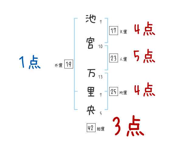 外運![]() | 池宮万里央さんの外運は19画の1つ星!優れた才能を持ちますが、協調性が足りないことも。周りの人と協力する事を意識しましょう。 生活面を象徴する運勢です。外部から受ける影響力を表し、結婚運、家庭運や職場、環境への順応性を表します。 |
