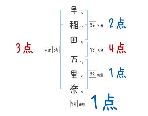 外運![]() | 早稲田万里奈さんの外運は36画の3つ星!先見性が豊かです。多少神経質で苦労することも。 生活面を象徴する運勢です。外部から受ける影響力を表し、結婚運、家庭運や職場、環境への順応性を表します。 |