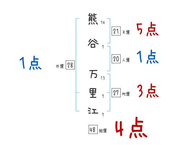 外運![]() | 熊谷万里江さんの外運は28画の1つ星!家庭環境に注意。スポーツで活躍できる能力があるかも。 生活面を象徴する運勢です。外部から受ける影響力を表し、結婚運、家庭運や職場、環境への順応性を表します。 |