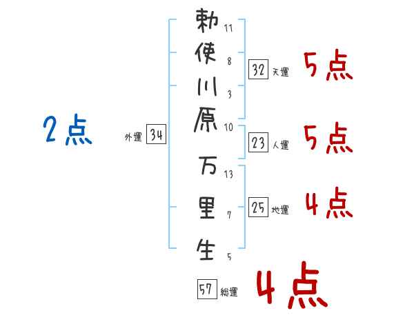 天運![]() | 勅使川原万里生さんの天運は32画の5つ星!柔軟性があり成功する。チャンスが多く金運が良い。 家系が持つ宿命的な運勢を表します。祖先から受け継いだ苗字ですので自分の力が及びません。家柄を象徴します。 |