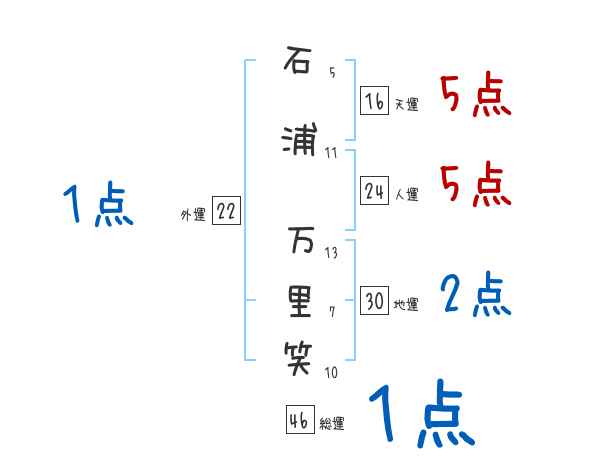 天運![]() | 石浦万里笑さんの天運は16画の5つ星!人望が厚く大きく発展する。逆転成功が見える。 家系が持つ宿命的な運勢を表します。祖先から受け継いだ苗字ですので自分の力が及びません。家柄を象徴します。 |