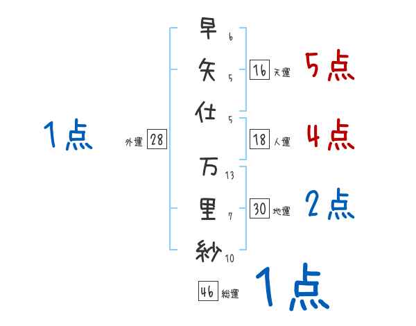 天運![]() | 早矢仕万里紗さんの天運は16画の5つ星!人望が厚く大きく発展する。逆転成功が見える。 家系が持つ宿命的な運勢を表します。祖先から受け継いだ苗字ですので自分の力が及びません。家柄を象徴します。 |