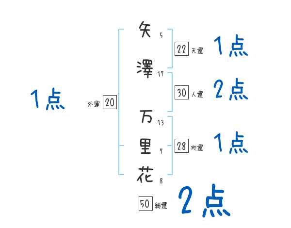 | 天運  | 矢澤万里花さんの天運は22画の1つ星!努力することが苦手ないっぽう手先が器用。芸術性にも優れる。家系が持つ宿命的な運勢を表します。祖先から受け継いだ苗字ですので自分の力が及びません。家柄を象徴します。 |