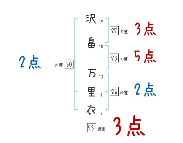 総運![]() | 沢畠万里衣さんの総運は53画の3つ星!やや見栄っ張りで虚栄心がある。散財に注意。 あなたの人生を表す1番重要な運勢です。生涯を通じて影響する総合運となり、主に50歳以降の晩年期に影響を及ぼします。 |