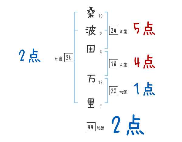 外運![]() | 桑波田万里さんの外運は26画の2つ星!波瀾万丈かも。信頼できる人を大事にしましょう。 生活面を象徴する運勢です。外部から受ける影響力を表し、結婚運、家庭運や職場、環境への順応性を表します。 |