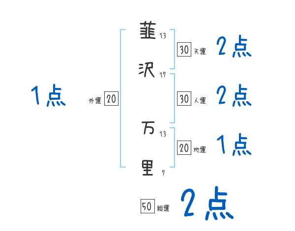 天運![]() | 韮沢万里さんの天運は30画の2つ星!浮き沈みの激しさに注意しましょう。 家系が持つ宿命的な運勢を表します。祖先から受け継いだ苗字ですので自分の力が及びません。家柄を象徴します。 |