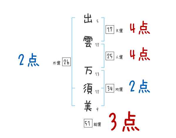外運![]() | 出雲万須美さんの外運は26画の2つ星!波瀾万丈かも。信頼できる人を大事にしましょう。 生活面を象徴する運勢です。外部から受ける影響力を表し、結婚運、家庭運や職場、環境への順応性を表します。 |
