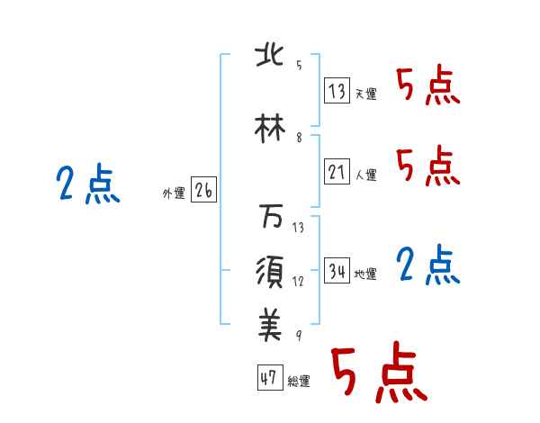 総運![]() | 北林万須美さんの総運は47画の5つ星!実力が開花し発展する円満な人生。財に恵まれる。 あなたの人生を表す1番重要な運勢です。生涯を通じて影響する総合運となり、主に50歳以降の晩年期に影響を及ぼします。 |