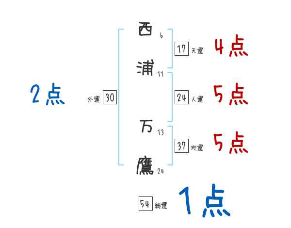 外運![]() | 西浦万鷹さんの外運は30画の2つ星!浮き沈みの激しさに注意しましょう。 生活面を象徴する運勢です。外部から受ける影響力を表し、結婚運、家庭運や職場、環境への順応性を表します。 |