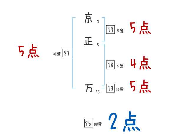 天運![]() | 京正万さんの天運は13画の5つ星!才能に恵まれ人気がある。名声を手に入れる。円満な人生。 家系が持つ宿命的な運勢を表します。祖先から受け継いだ苗字ですので自分の力が及びません。家柄を象徴します。 |