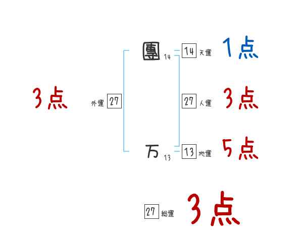 外運![]() | 團万さんの外運は27画の3つ星!頭脳明晰だが強情で摩擦が多い傾向。孤立に注意。 生活面を象徴する運勢です。外部から受ける影響力を表し、結婚運、家庭運や職場、環境への順応性を表します。 |