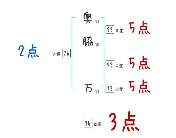 外運![]() | 奥脇万さんの外運は26画の2つ星!波瀾万丈かも。信頼できる人を大事にしましょう。 生活面を象徴する運勢です。外部から受ける影響力を表し、結婚運、家庭運や職場、環境への順応性を表します。 |