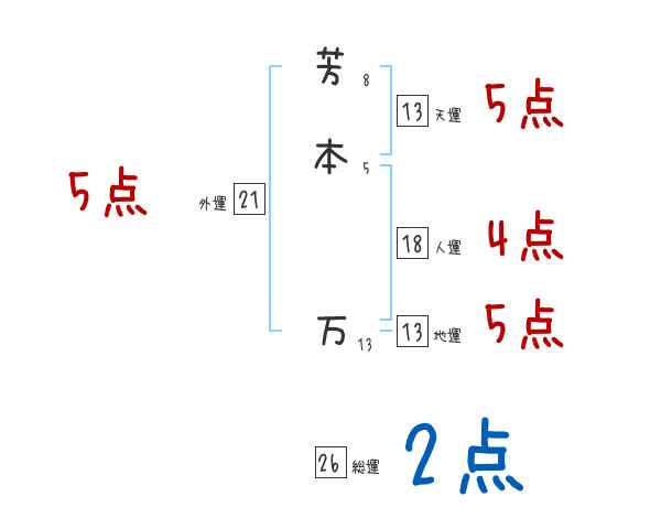 総運![]() | 芳本万さんの総運は26画の2つ星!波瀾万丈かも。信頼できる人を大事にしましょう。 あなたの人生を表す1番重要な運勢です。生涯を通じて影響する総合運となり、主に50歳以降の晩年期に影響を及ぼします。 |