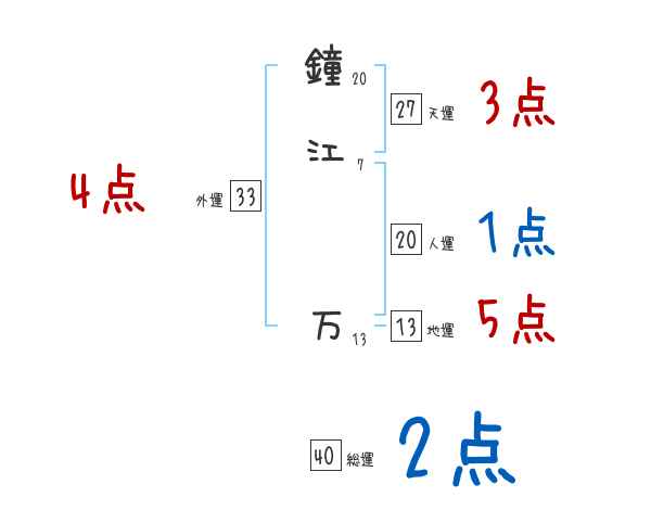 外運![]() | 鐘江万さんの外運は33画の4つ星!権力志向でプライドが高い。勇気があり運を切り開き成功する。 生活面を象徴する運勢です。外部から受ける影響力を表し、結婚運、家庭運や職場、環境への順応性を表します。 |