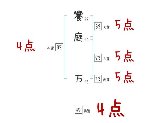 天運![]() | 饗庭万さんの天運は32画の5つ星!柔軟性があり成功する。チャンスが多く金運が良い。 家系が持つ宿命的な運勢を表します。祖先から受け継いだ苗字ですので自分の力が及びません。家柄を象徴します。 |