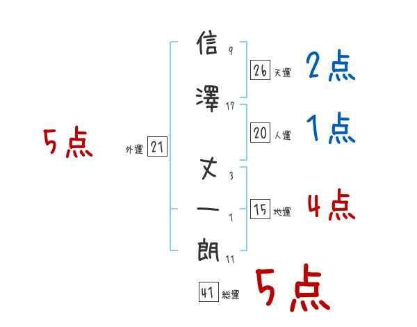 外運![]() | 信澤丈一朗さんの外運は21画の5つ星!統率力がある。独立し成功する。名誉を手に入れる。 生活面を象徴する運勢です。外部から受ける影響力を表し、結婚運、家庭運や職場、環境への順応性を表します。 |