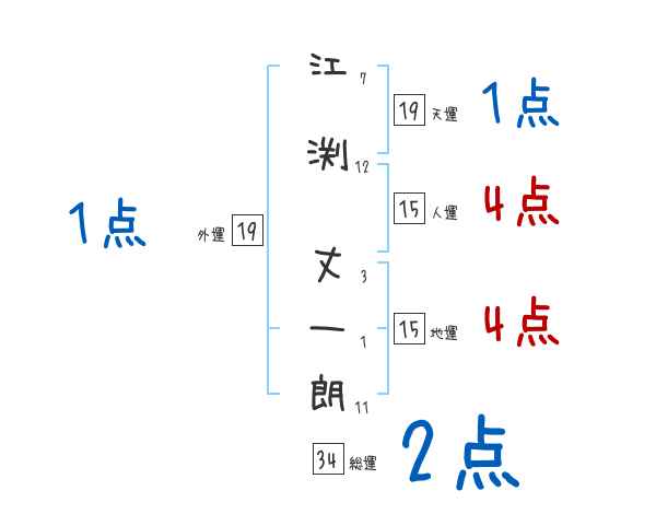 外運![]() | 江渕丈一朗さんの外運は19画の1つ星!優れた才能を持ちますが、協調性が足りないことも。周りの人と協力する事を意識しましょう。 生活面を象徴する運勢です。外部から受ける影響力を表し、結婚運、家庭運や職場、環境への順応性を表します。 |
