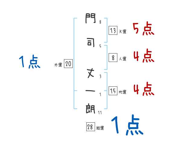 総運![]() | 門司丈一朗さんの総運は28画の1つ星!家庭環境に注意。スポーツで活躍できる能力があるかも。 あなたの人生を表す1番重要な運勢です。生涯を通じて影響する総合運となり、主に50歳以降の晩年期に影響を及ぼします。 |