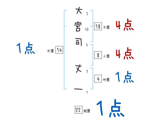 天運![]() | 大宮司丈一さんの天運は18画の4つ星!情熱的で剛気。忍耐力があり信頼される。 家系が持つ宿命的な運勢を表します。祖先から受け継いだ苗字ですので自分の力が及びません。家柄を象徴します。 |