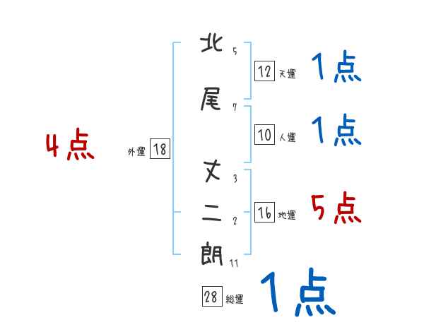 外運![]()  | 北尾丈二朗さんの外運は18画の4つ星!情熱的で剛気。忍耐力があり信頼される。 生活面を象徴する運勢です。外部から受ける影響力を表し、結婚運、家庭運や職場、環境への順応性を表します。 |