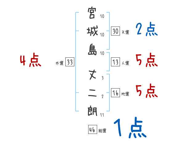 外運![]() | 宮城島丈二朗さんの外運は33画の4つ星!権力志向でプライドが高い。勇気があり運を切り開き成功する。 生活面を象徴する運勢です。外部から受ける影響力を表し、結婚運、家庭運や職場、環境への順応性を表します。 |