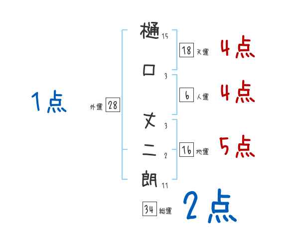 人運![]() | 樋口丈二朗さんの人運は6画の4つ星!慎重な努力家で信頼を得る。誠実な精神で向上心に優れる。 性格や才能などを表す2番目に重要な運勢です。人間関係や協調性、社会的な成功に影響します。主に20歳から50歳ぐらいまでの中年期の運勢を表します。 |