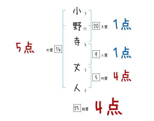 外運![]() | 小野寺丈人さんの外運は16画の5つ星!人望が厚く大きく発展する。逆転成功が見える。 生活面を象徴する運勢です。外部から受ける影響力を表し、結婚運、家庭運や職場、環境への順応性を表します。 |