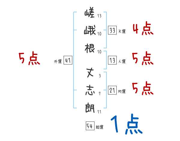 天運![]() | 嵯峨根丈志朗さんの天運は33画の4つ星!権力志向でプライドが高い。勇気があり運を切り開き成功する。 家系が持つ宿命的な運勢を表します。祖先から受け継いだ苗字ですので自分の力が及びません。家柄を象徴します。 |