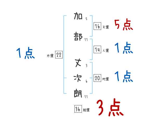 外運![]() | 加部丈次朗さんの外運は22画の1つ星!努力することが苦手ないっぽう手先が器用。芸術性にも優れる。 生活面を象徴する運勢です。外部から受ける影響力を表し、結婚運、家庭運や職場、環境への順応性を表します。 |