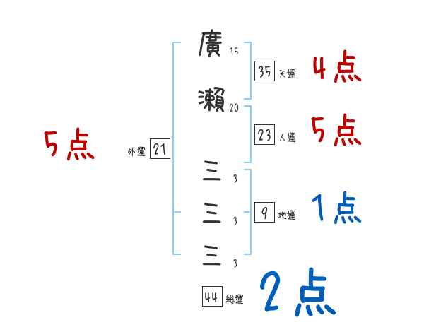 天運![]() | 廣瀨三三三さんの天運は35画の4つ星!温厚な性格で感受性が高い。穏和な性格で人望が厚い。 家系が持つ宿命的な運勢を表します。祖先から受け継いだ苗字ですので自分の力が及びません。家柄を象徴します。 |