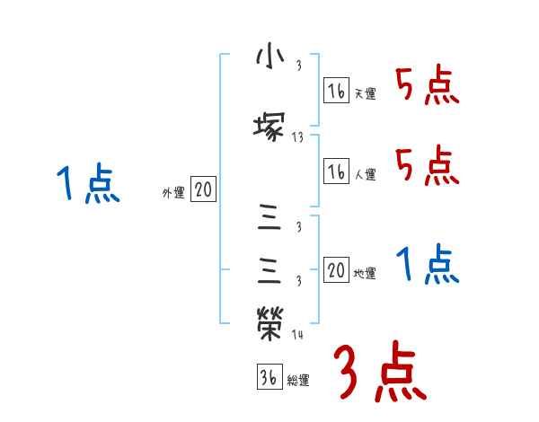 総運![]() | 小塚三三榮さんの総運は36画の3つ星!先見性が豊かです。多少神経質で苦労することも。 あなたの人生を表す1番重要な運勢です。生涯を通じて影響する総合運となり、主に50歳以降の晩年期に影響を及ぼします。 |